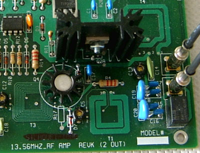 The PCB on the right encompasses planar RF transformers operating at 13.56MHz.